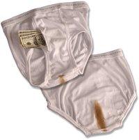 El mundo cambia mucho y últimamente hay unos panoramas por las calles… Y es que te atracan en cualquier sitio! Quién no ha oído el mítico: «Oyeee dame un eurooo» y segundos más tarde se las ha visto sin cartera ni reloj ni un duro céntimo. Pues este producto puede sacarte de más de un apuro. Se trata de unos calzoncillos que seguro que nunca te los robarán, ni los tocarán, gracias a su mancha que «simula»… no hace falta decirlo. Su función, guardar el dinero en el compartimento especial situado en la parte delantera.